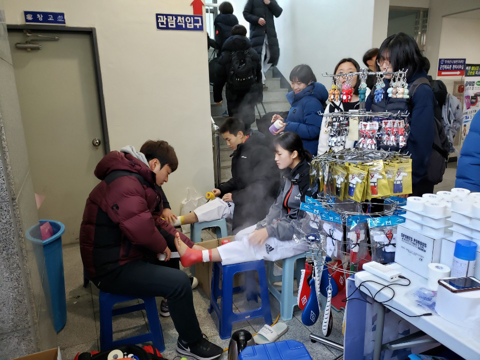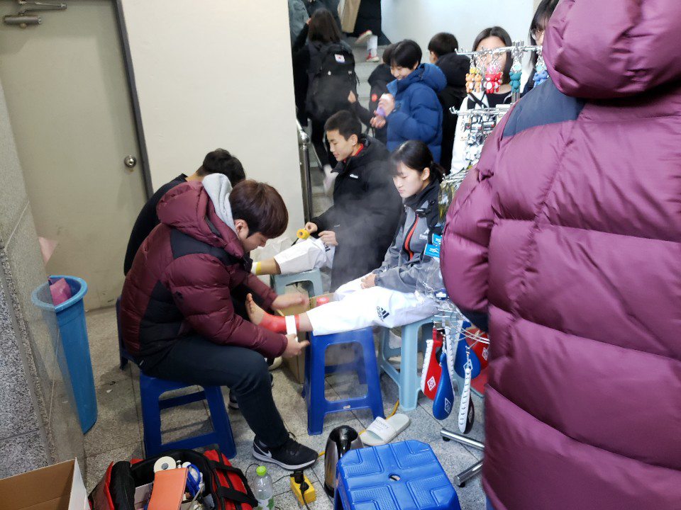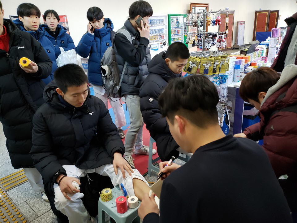 ¼±¼öµéÀÌ ½ÃÇÕÀ» Çϱâ Àü ºÎ»ó¿¹¹æÀ» À§ÇØ Å×ÀÌÇÎÀ» ¹Þ´Â ¸ð½ÀÀÔ´Ï´Ù.